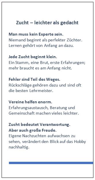 Mit diesem Verstehen wächst auch die Verantwortung: für gesunde Tiere, für typische Merkmale und letztlich für den Erhalt der Rassen, die unser Hobby so vielfältig machen.
